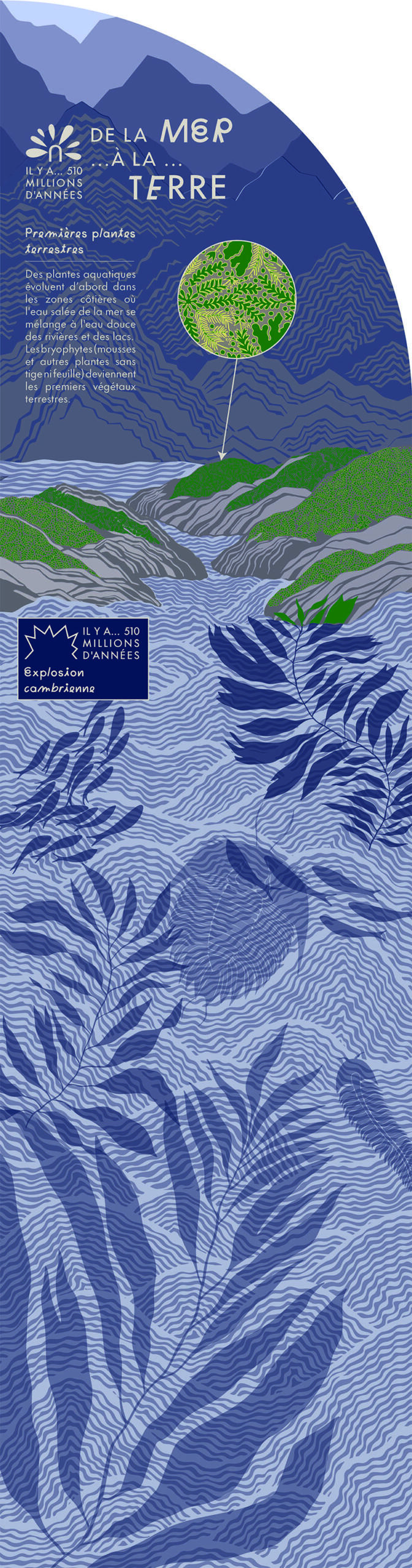 De la terre à la mer – panneaudécembre 21, 2025Le monde marin explore la terreLes premières plantes terrestres Ere géologiquePalézozoïquePériodeOrdovicienMa500 Ma - 435 MaDistance60 mIllustratriceJudith LegrosShareBook-open